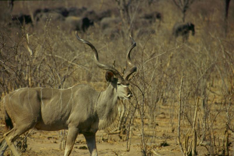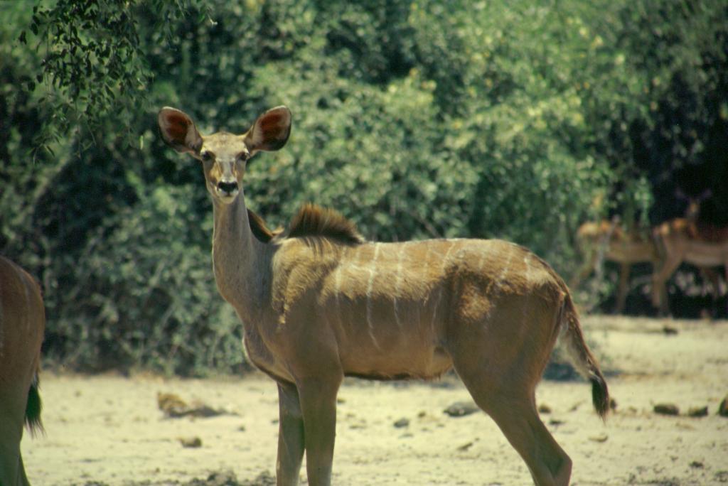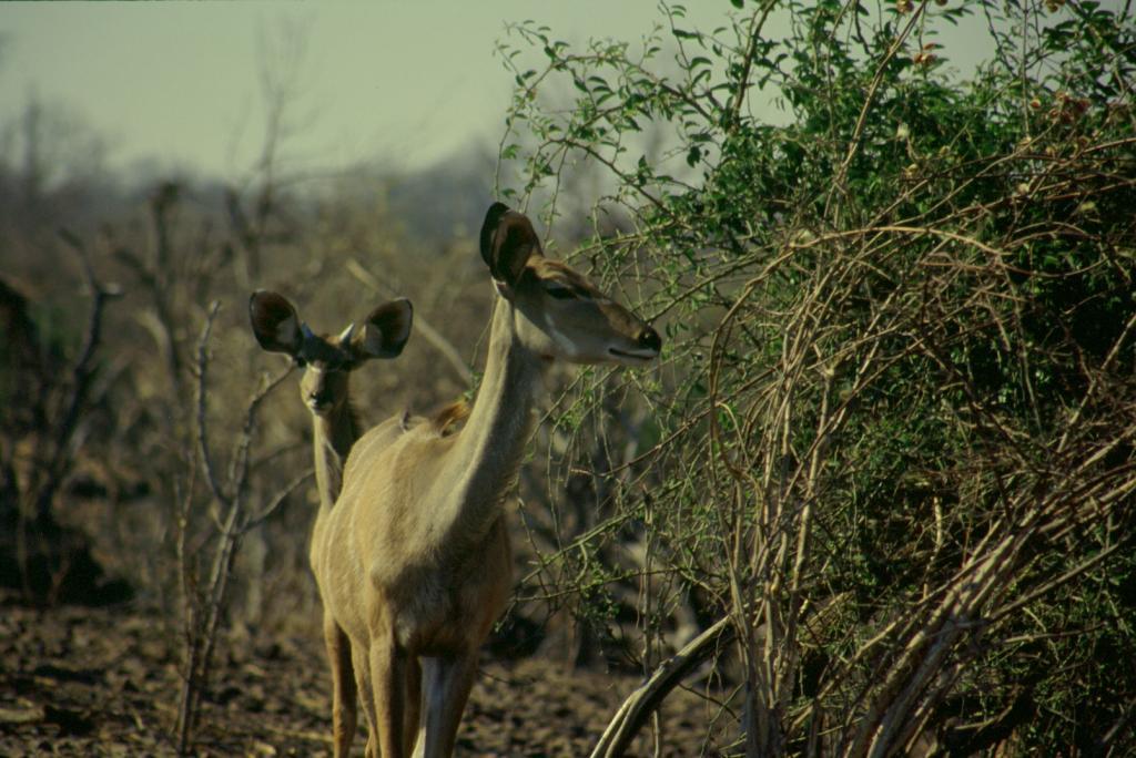 zwei Nyala-Weibchen Rechts: der grosse Kudu hat das grösste und beeindruckendste Korkenzieher-Geweih |